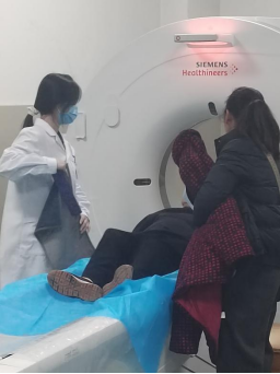 黎俊秀在余庆县人民医院辅助病人做CT检查